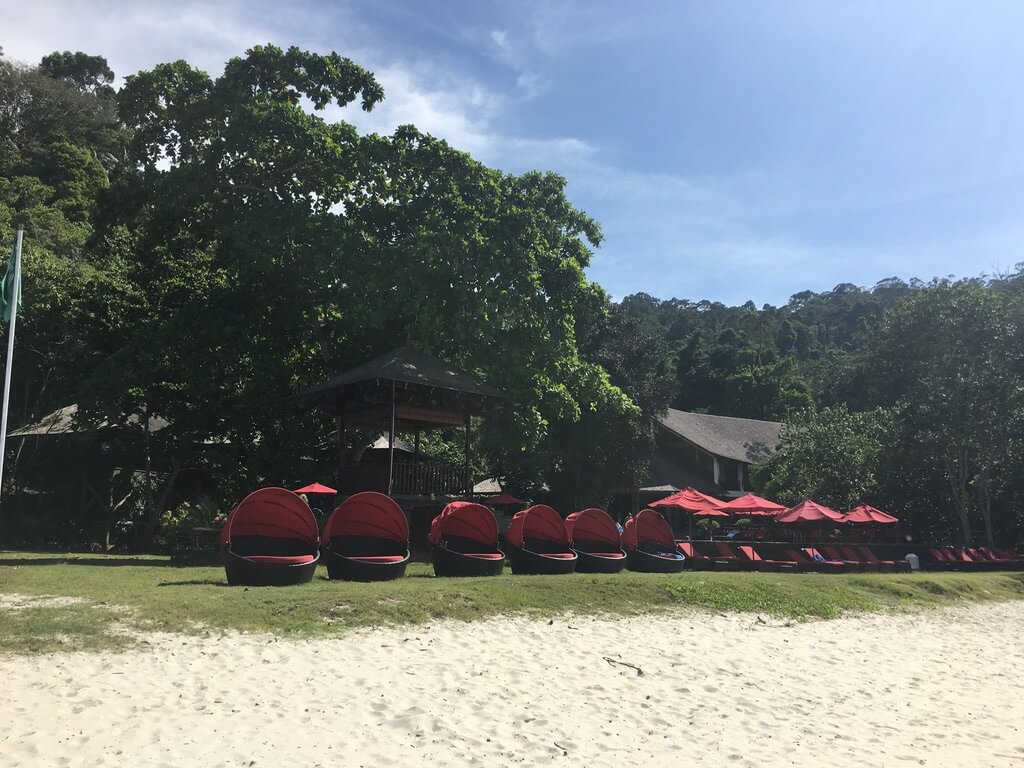 Inside you have all the mod cons you could need in a traditional feeling luxury lodge, right off the coast of Borneo! What more could you want? On the bed we found two complimentary sarongs made from stunning material. The veranda went around two sides of our lodge and ours had a lovely view out to sea. There are two restaurants to choose from, an enormous wine cellar you can walk around and even choose tonight’s bottle from. At night wild boars come down to the beach and roam around while you have dinner.