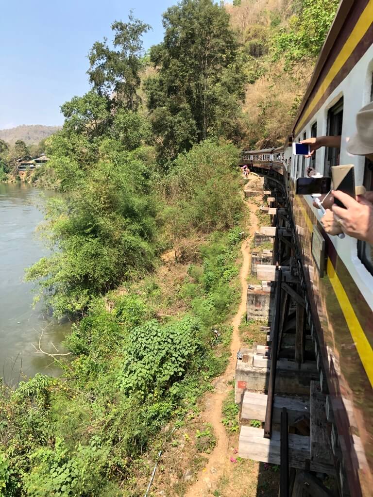 There are several stations where you can jump on the Death Railway train, we chose Thakilen. Trapped in a time warp it is a really cute station! The guard was dressed in an immaculate uniform and waved his flags around as the train approached. Choose your seat; either side of the train will do as you will get amazing views at different times from each side (see below).